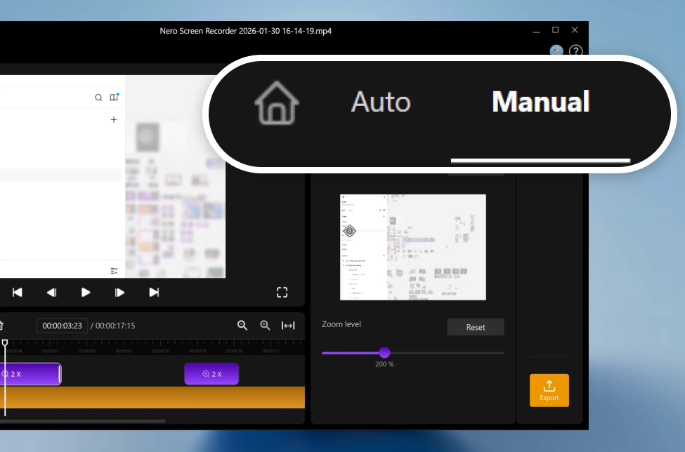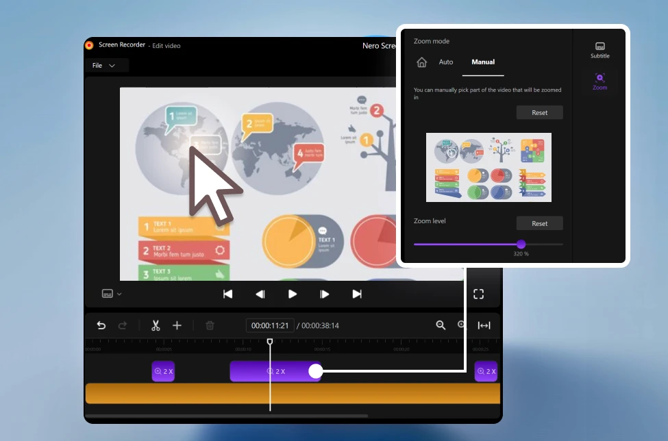 Ever recorded a tutorial only to find viewers miss your mouse clicks? Nero Screen Recorder's Auto Zoom automatically tracks your click positions and smoothly zooms in during playback, ensuring viewers never miss key actions.