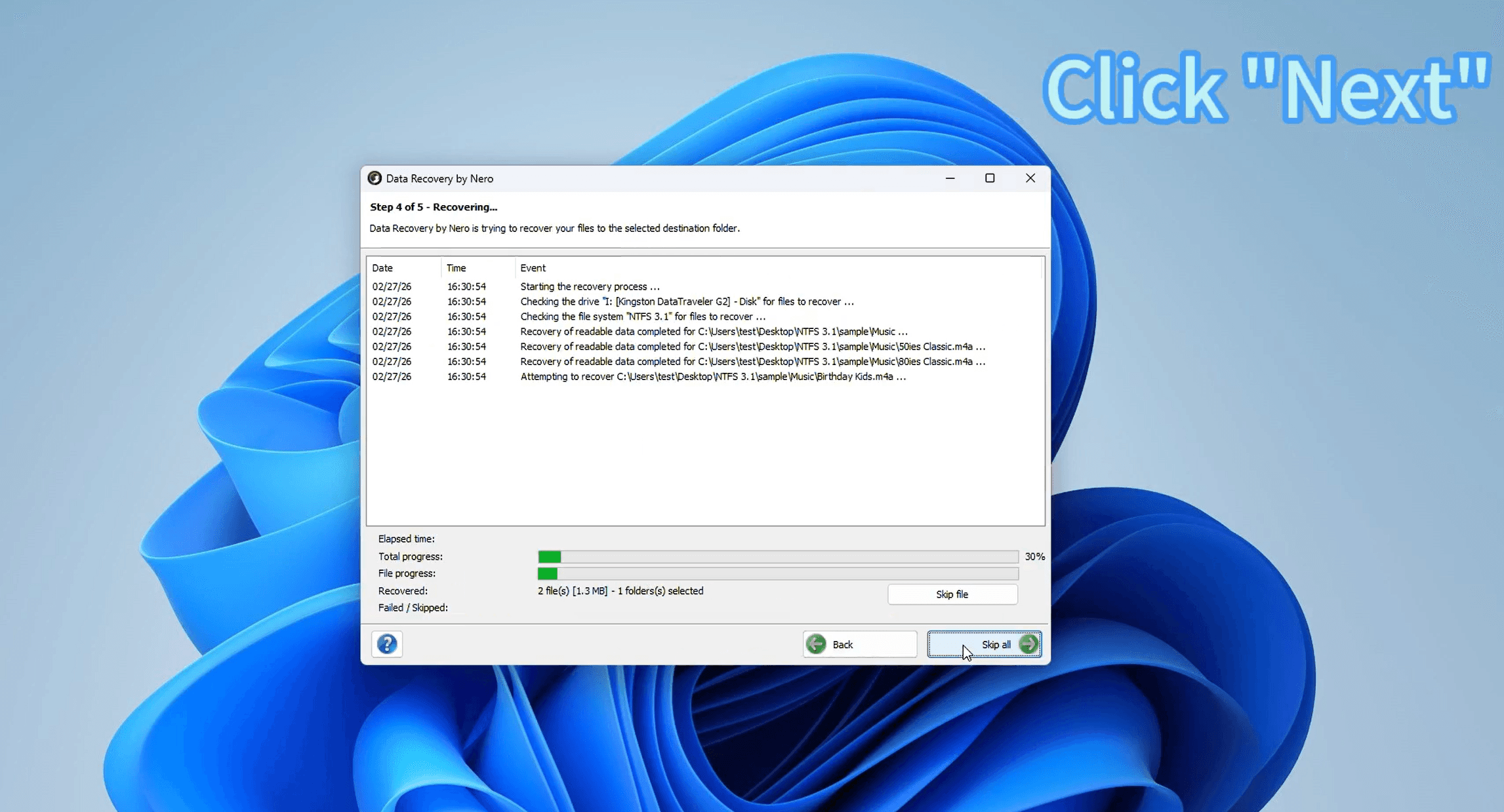 Click Next and Data Recovery by Nero will begin restoring your files. You'll see a real-time log showing each file being recovered, along with a progress bar. You can monitor the process directly on screen.