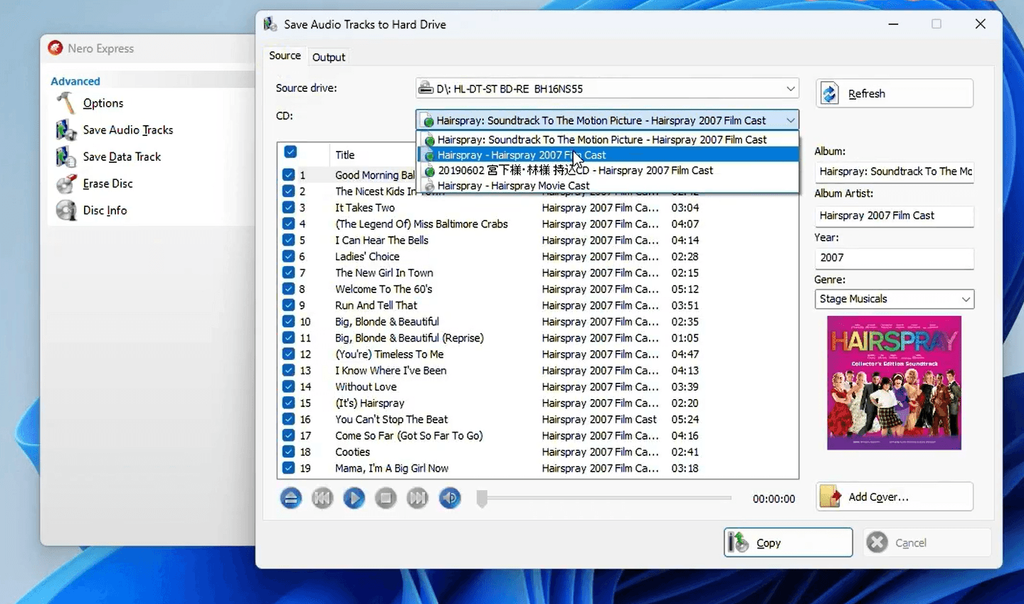 Insert your audio CD into the disc drive. Nero Express will automatically detect the disc and query an online music database to retrieve album metadata — track titles, artist names, album art, year, and genre. In the Source tab, use the CD dropdown to confirm the correct album is selected. If multiple entries appear, choose the one that best matches your disc.