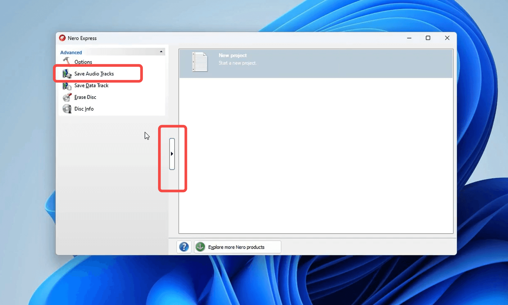Launch Nero Express after installation. In the left-hand panel under Advanced, you will see several options. Click on "Save Audio Tracks" — this is the dedicated ripping function that reads audio data directly from your CD and saves it to your hard drive in your chosen format.