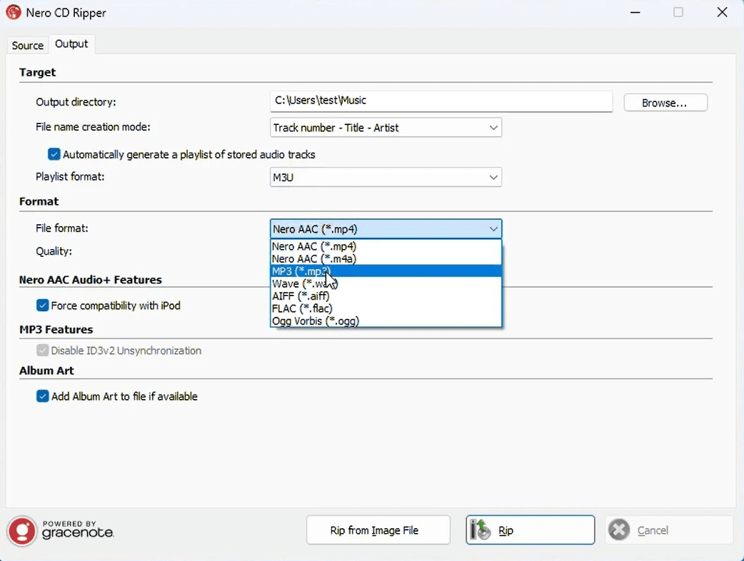 出力先ディレクトリ: リッピングしたファイルを保存するコンピュータ上の場所を選択します。ほとんどの人はデフォルトのミュージックフォルダを使用しますが、お好みの場所を選択できます。