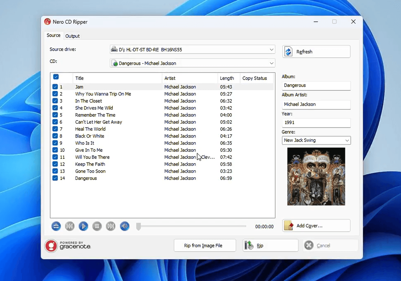 音楽 CDをコンピュータのディスクドライブに挿入します。Nero CD Ripperを起動すると、ソフトウェアが自動的にディスクを検出します。数秒以内に、画面上に完全なアルバム情報が表示されます: