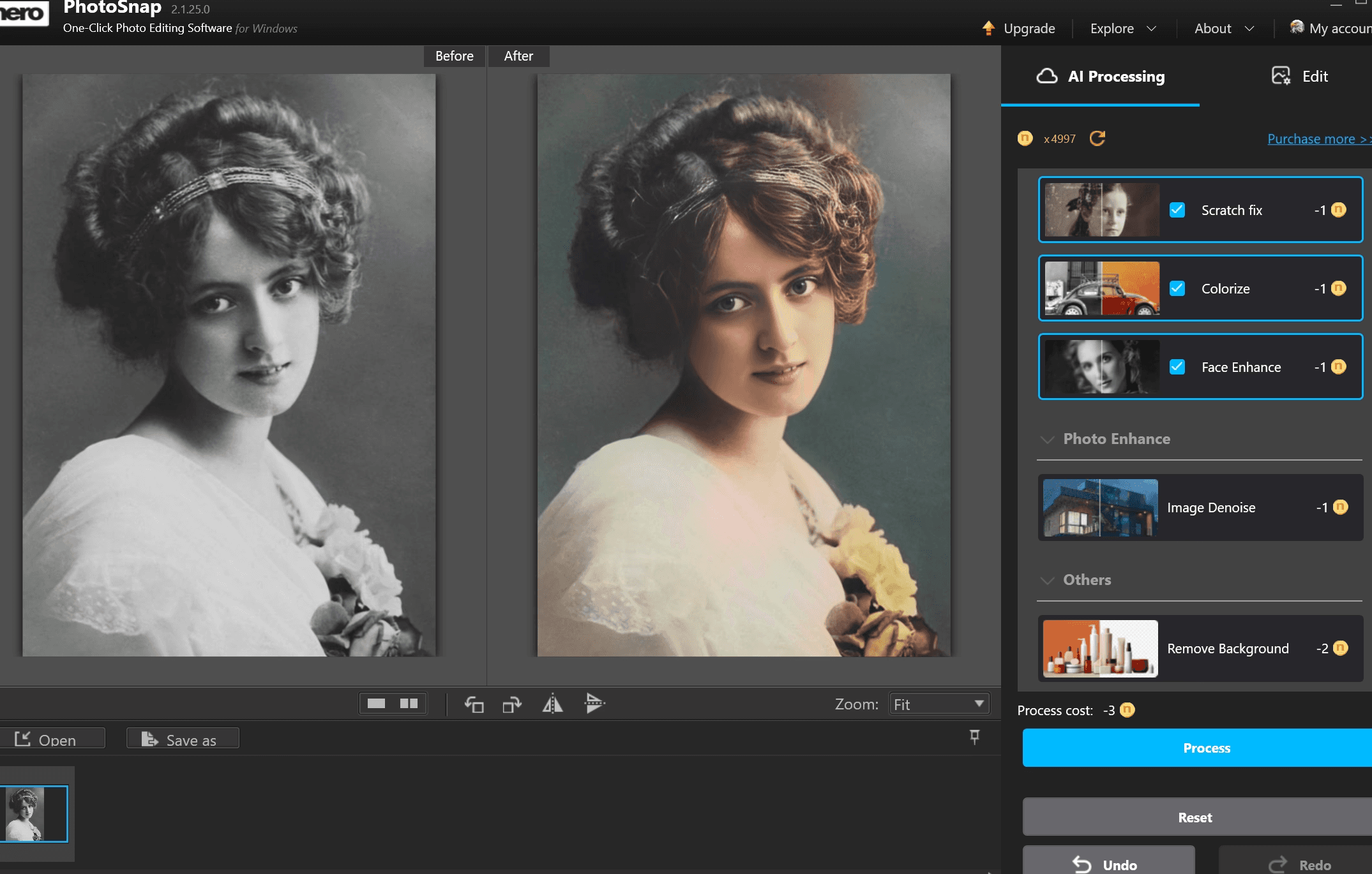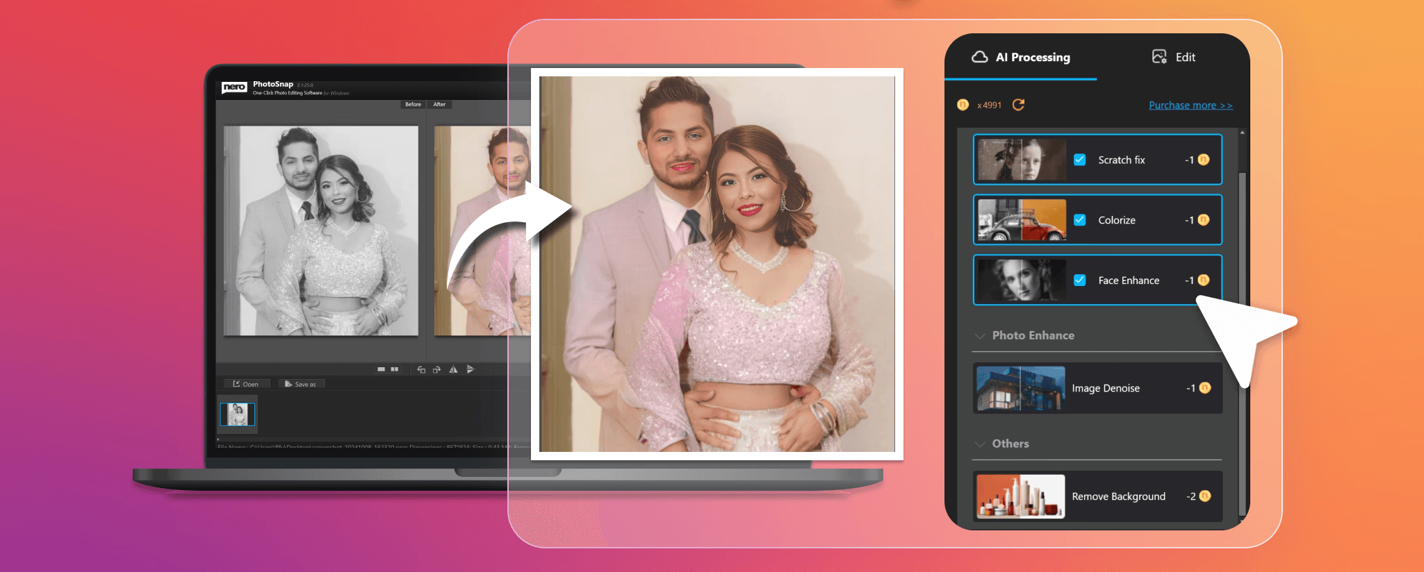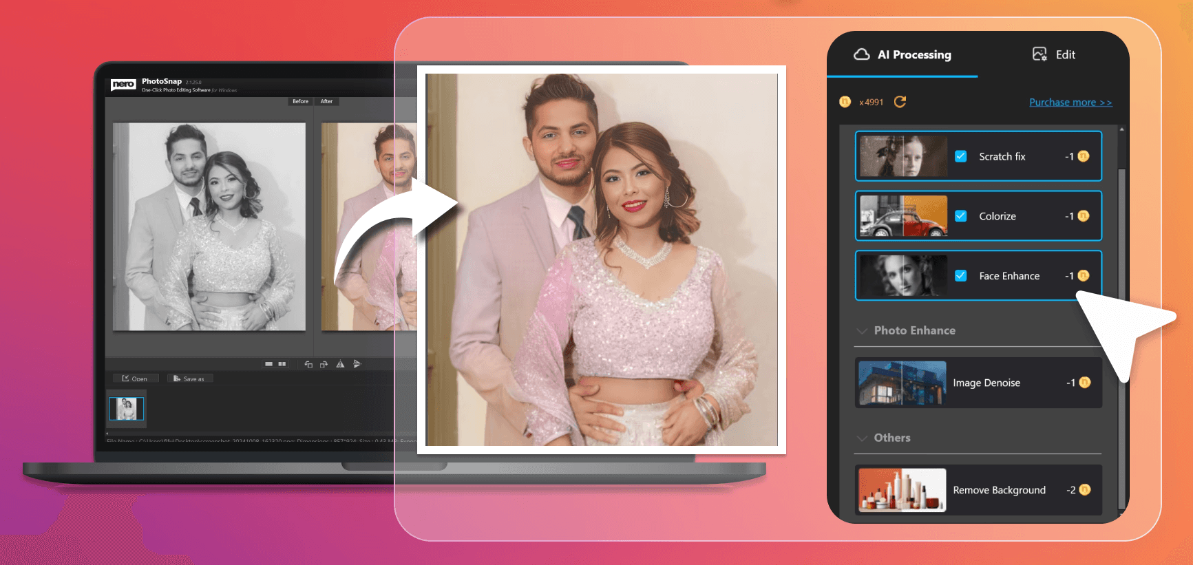 Instant photo editing with AI: Colorize/ Restore/Remove background.